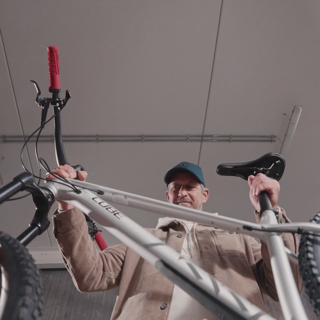 The integrated torque limiter in the rotary knob controls the force applied to the bicycle frame, reliably protecting sensitive frames. Large, soft pads on the frame holder ensure secure fixation without damage. The wheels are stably secured using diagonally guided rim straps with quick-release fasteners.